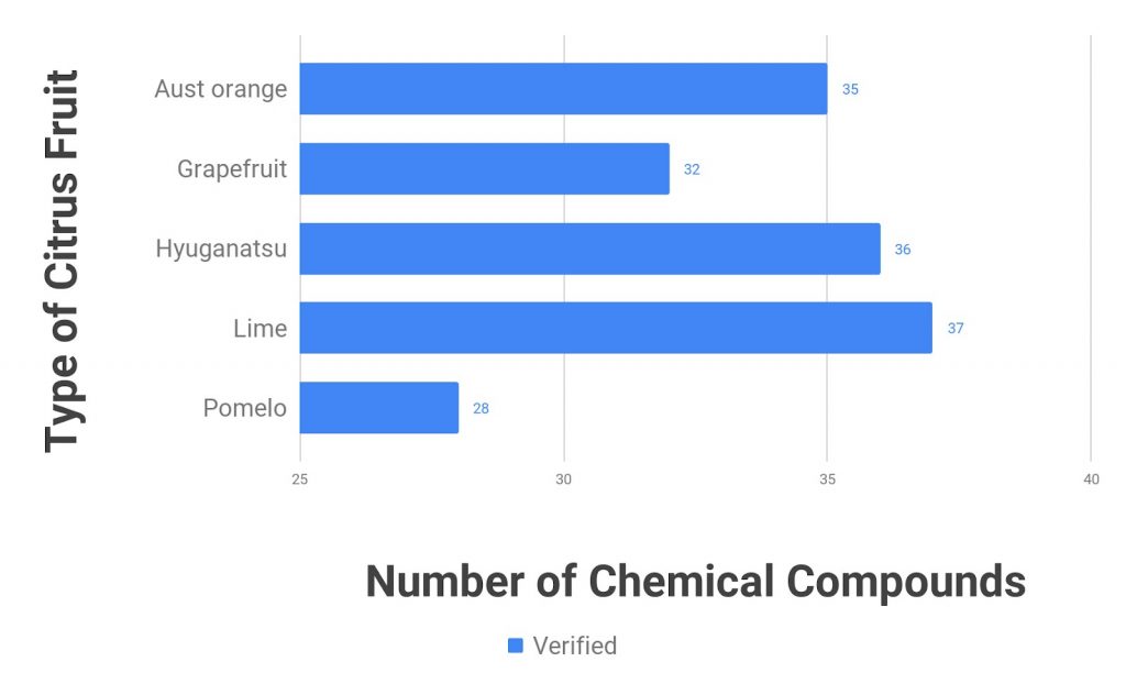 We found that limonene was present in the highest concentration as compared to other volatile chemical compounds across the five types of citrus fruits. Limonene is classified as a cyclic monoterpene and is a volatile compound that makes up for at least 79% across the five different citrus fruit samples. Pomelo has the highest limonene content of 92%, followed by lime, grapefruit, orange and hyuganatsu. Limonene is commonly used as a fragrance and flavoring ingredient and is known to give off a lemon, minty and orange odor. It demonstrates anti-cancer properties, relieve heartburn and reduce stress, anxiety and depression. Not only that, limonene also have many other great benefits. Therefore, limonene is commonly used in aromatherapy and orally taken in the form of soft gel capsules.