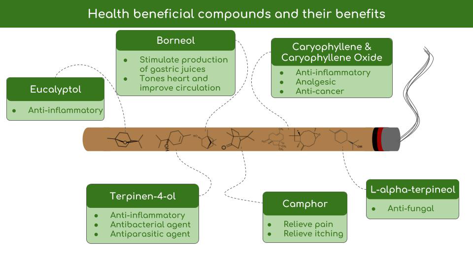 实验结果非常明确的可看到,以其中7中有益成分为例:桉树醇、冰片、石竹烯、氧化石竹烯、松油烯-4-醇、樟脑和L-α-松油醇。从新加坡本地药店买来的艾条中有益成分比从淘宝买来的艾条多得多,淘宝售卖的艾条有益成分含量非常低。