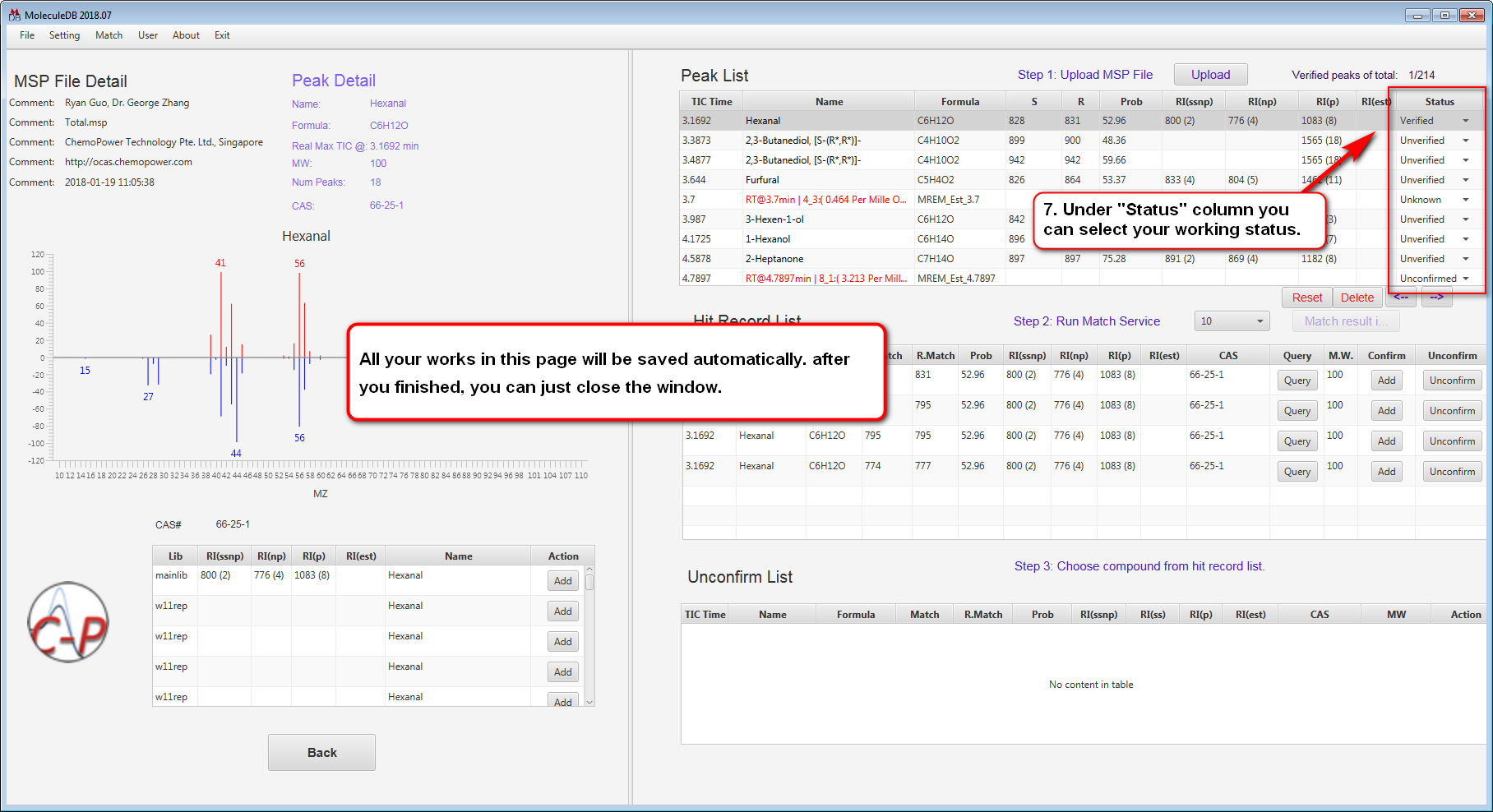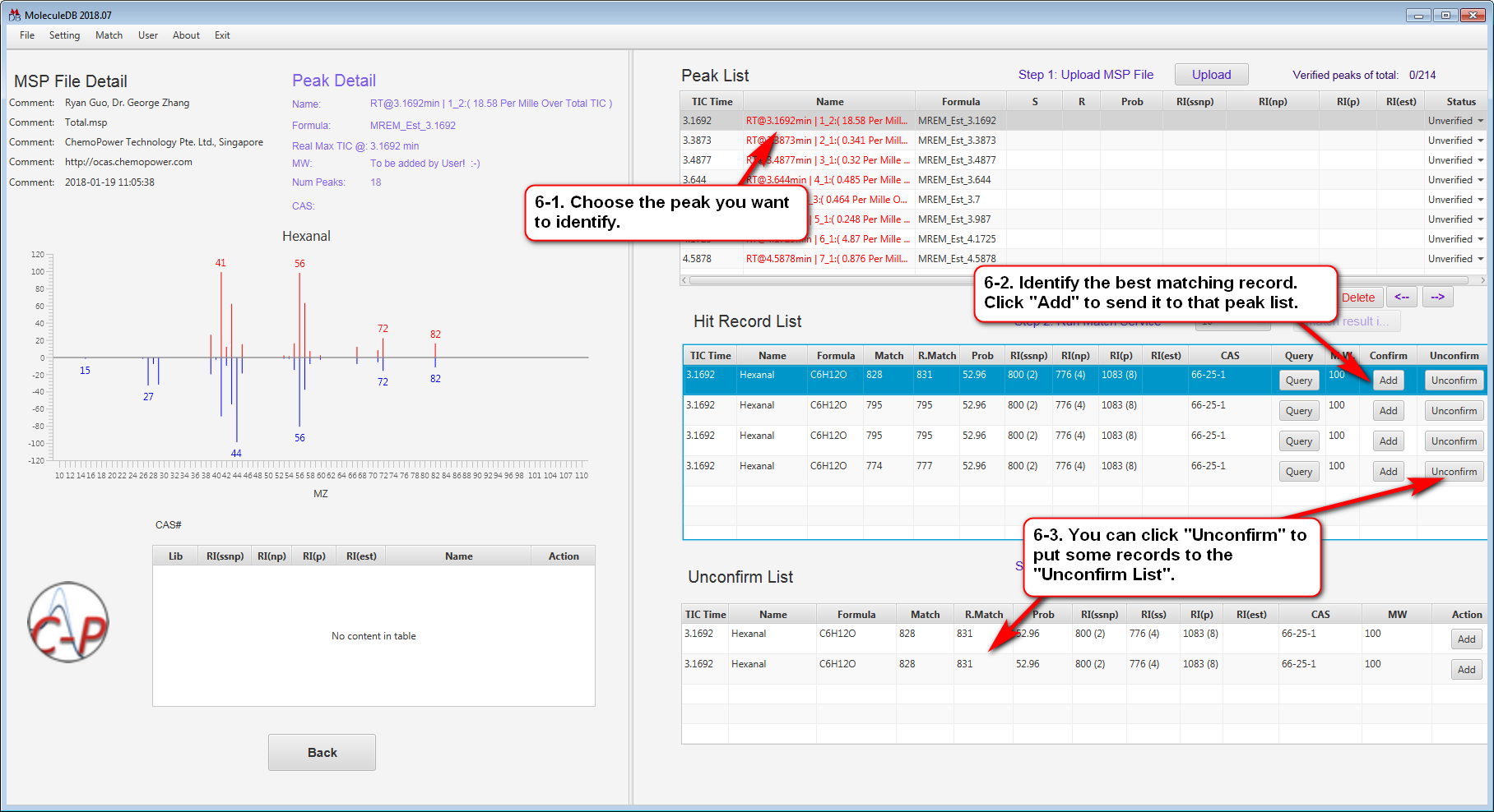 - Base on the diagram on the left and other information (e.g. Match, R.Match and RI) in the “Hit Record List”, you can decide which record can describe the peak best.